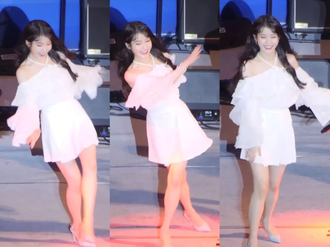 而在演唱《LEON》时,IU做跳跃动作,高跟鞋突然打滑,晃了好几下,不过她丝毫不被影响。